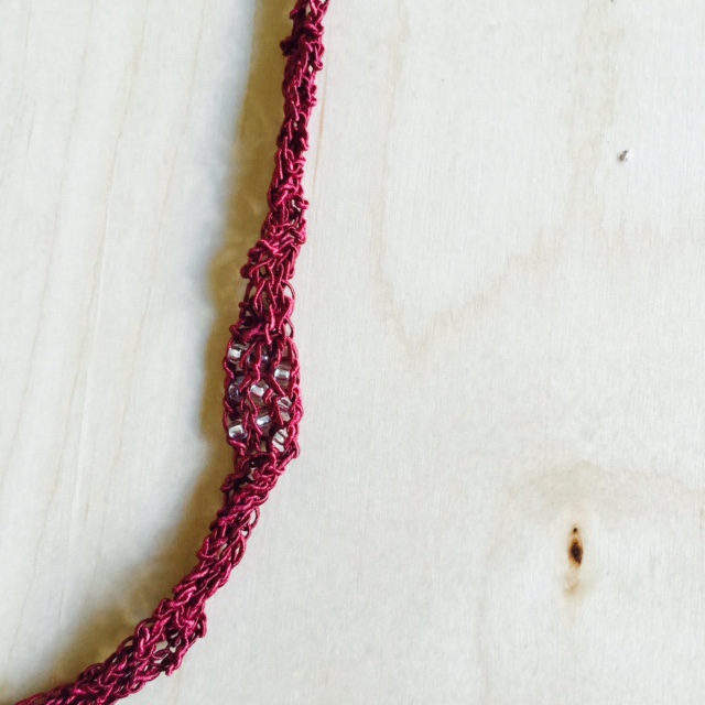 Margaret continued her exploration of long stranded bead necklaces/wrap bracelets.  She’s getting the hang of the Wrap Around Crochet Bracelet by Yuli Nilssen:  she’s using heavier weight yarn and a smaller crochet hook than last time.   Probably a little tighter stitch after the beads would help even more.  The last photo is a comparison of the first attempt and the second.  (It’s all about learning, right?)