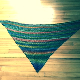 Margaret talks about her (right brained) knitting for the Crazy Triangle Crochet Shawl. She verrrrry loosely adapted the Sweet November Shawl by Guylaine Godin. The goal was a wide triangle with less open mesh but in fact, the shawl turned out deeper and less wide. Well, maybe next time. She used Crazy Zauberball in some unknown colorway.