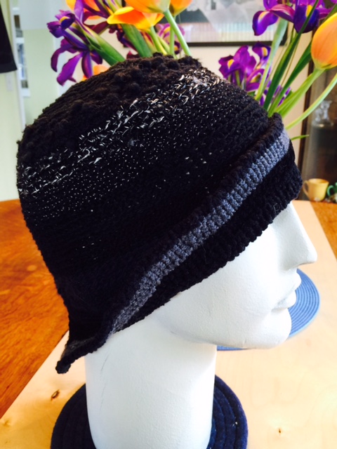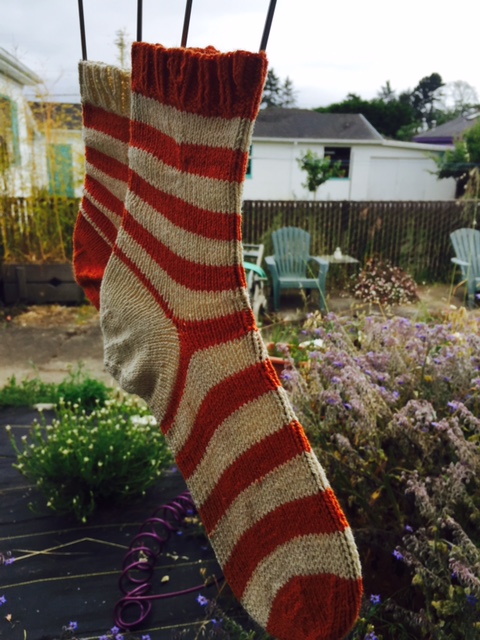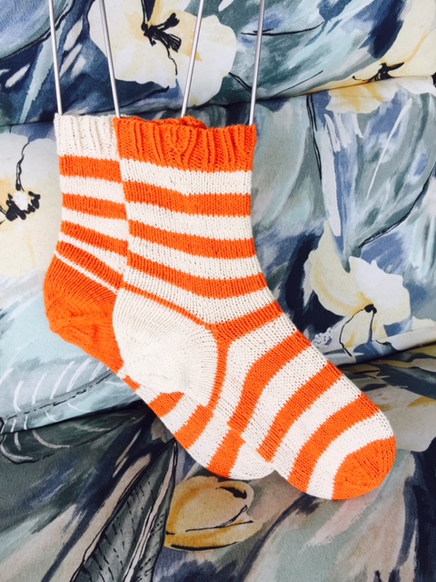 Recently, she tried Skacel’s Hi Koo CoBaSi in Carrot and Cream. She made up her own pattern but recommends Nigel Pottle’s Tom and Ethel Socks.