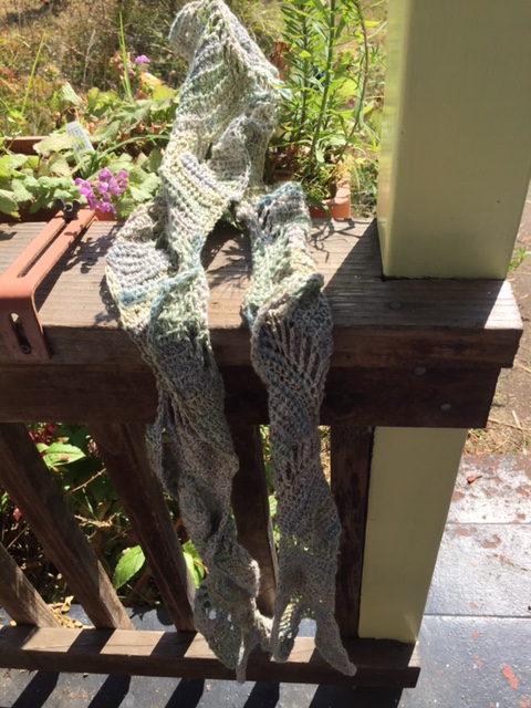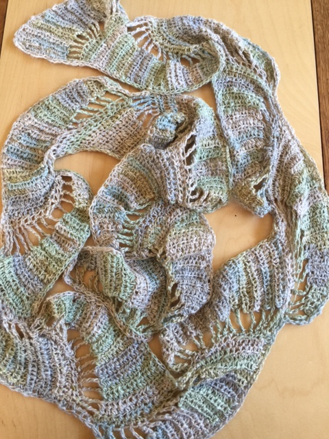 Margaret crocheted the Boteh Scarf   http://www.ravelry.com/patterns/library/boteh-scarfin by Kathy Merrick out of nearly three balls of Bella Lino  58% Linen, 26% viscose, and 16% cotton  http://www.ravelry.com/yarns/library/classic-elite-yarns-bella-lino .