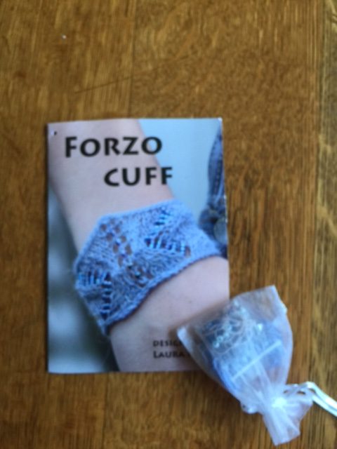 Margaret isn’t ready for the challenges of The Forzo Cuff by Laura Nelkin http://www.ravelry.com/patterns/library/forzo-cuff. She will give away her slightly used kit to someone who is. Just post on the Ravelry thread — first come, first served. It is knitted lace. Find the difference between that and lace knitting: http://theknittingbuzz.typepad.com/the-knitting-buzz/2011/03/knitted-lace-vs-lace-knitting.html.
