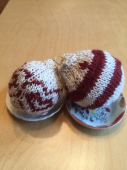 Photos: The stripped ornament was a practice one — less complicated to be able to concentrate on knitting with double points. (no pattern) Still looking for pattern with hearts. Sorry.