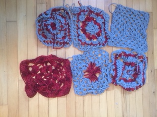 Margaret finished the crocheted blocks (from The Big Book of Granny Squares by Tracey Lord) for a lap blanket. She finished #33, #133, #66 and #178 and two others she didn’t write down. Now she plans to piece together the blocks with a stitch of some sort but she’s not sure what yet. Finally she wants to felt it. She hopes the finished results will be a nice felted blanket that she’ll donate to charity. The yarns are Valley Yarns 100 % Wool Northampton Bulky Light Grey and Araucania Yarns Nature Wool Chunky Deep red/black or black/red. Her hook size was K.