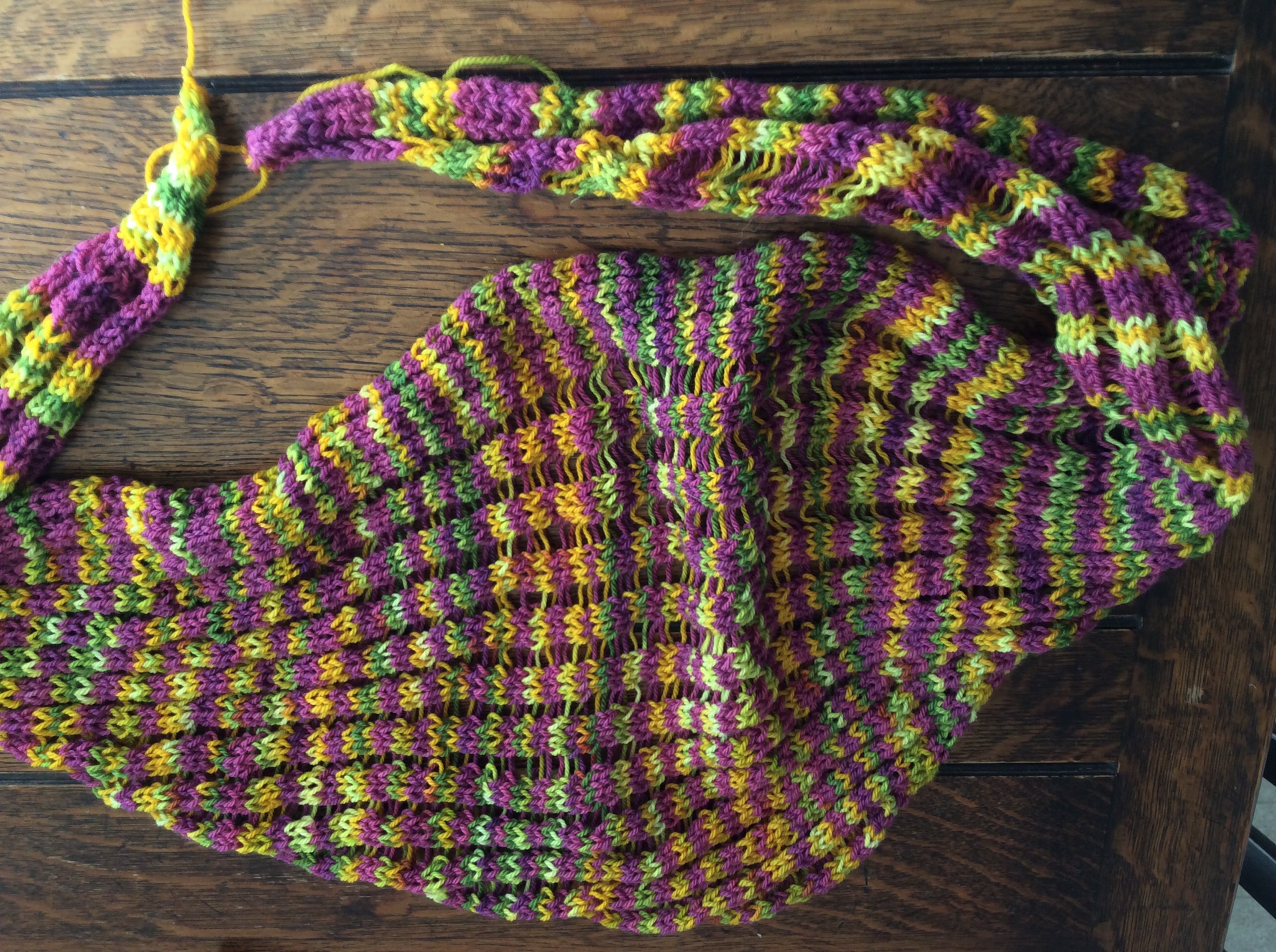 Catherine is making progress on her Sock Yarn Blanket by Shelley Kang and her Meadowlark Shibori Jacket (by Gina Wilde with Alchemy Yarns.) She also mentions her Rockefeller shawl by Stephen West.