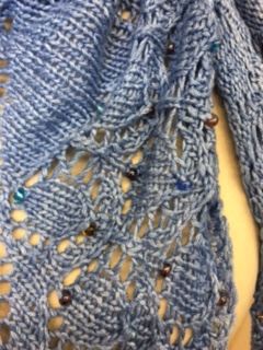 Catherine found what she wanted to do with her Great Adirondack Yarn Company’s Well Dressed Sheep (cotton/rayon/metallic in chunky weight) in the Beach House colorway. She’s adapting a border design “Cabled Lace” from Leisure Arts’s 50 Fabulous Borders by Rita Weiss that she found at the Foggy Bottoms Yarn Store in Ferndale.